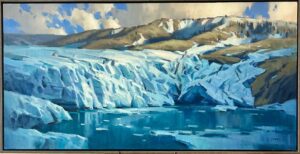 Fielding Hills Winery is proud to host “Ancient Advance”, a striking oil-on-linen painting by Washington artist Rowan Carey. Measuring 24 by 48 inches, the work brings to life the Chelan Valley as it appeared some 17,000 years ago, when the continental ice sheet advanced through the valley, covering the landscape in hundreds of feet of glacial ice.