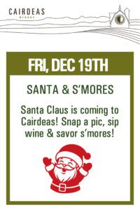 He’s making a list… and stopping at Cairdeas! Santa Claus is landing at the Cairdeas Barn in Lake Chelan on Friday, December 19th, from 2–5 PM. Bring the kids (and your holiday cheer!) for photos with Santa, then cozy up with a wine tasting flight and gourmet s’mores.